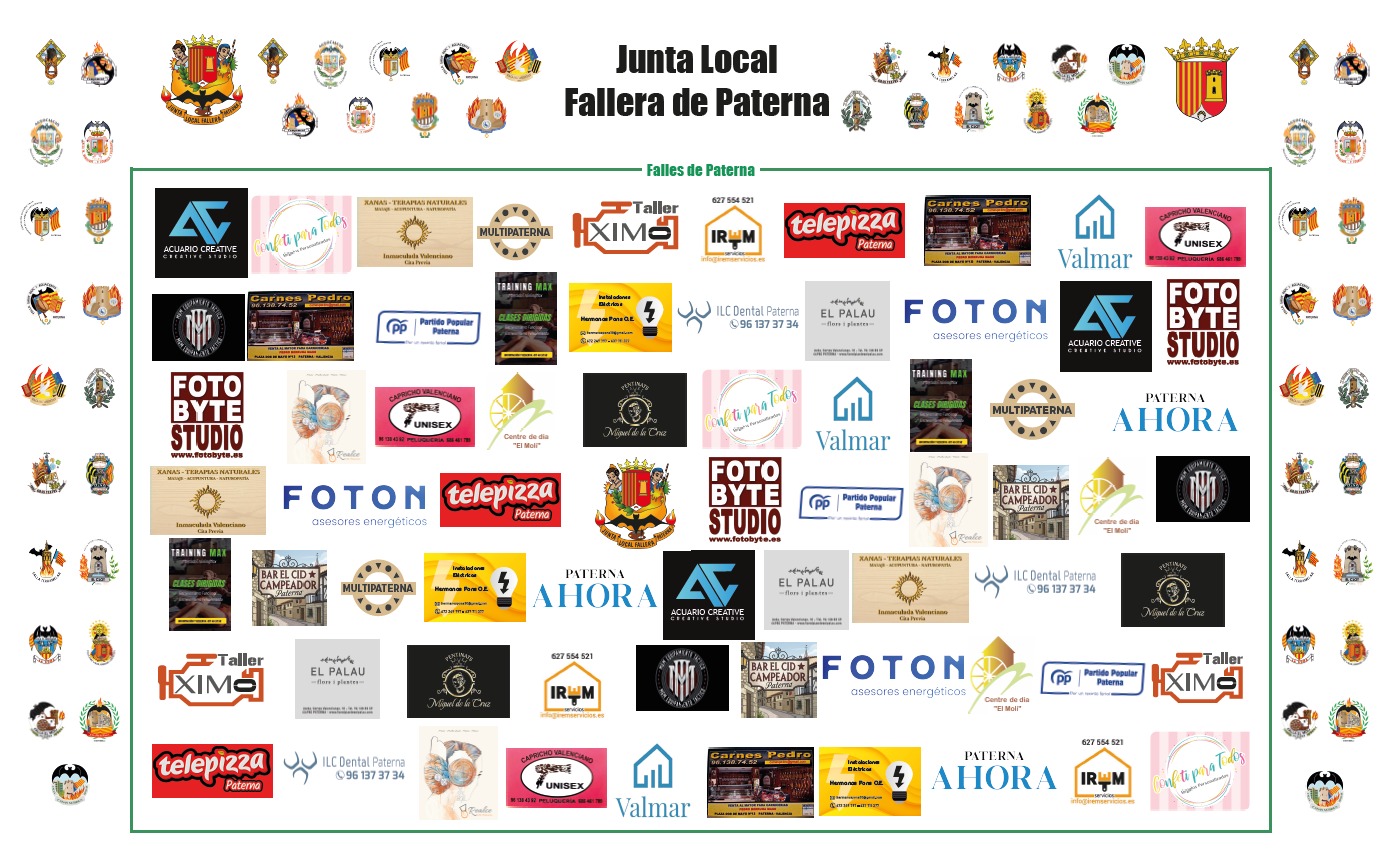 Els col·laboradors de la Junta Local Fallera, són una part especial de les nostres falles. Ens agrada pensar que lis ajudem a donar visibilitat al comerç local del nostre poble, creant o mantenint llocs de treball que beneficien a tota la societat. La seua implicació i participació a les falles de Paterna, és també un part esencial de la festa, ja que gràcies a ella, arribem on d’altra manera, no podriem. De tot cor GRÀCIES